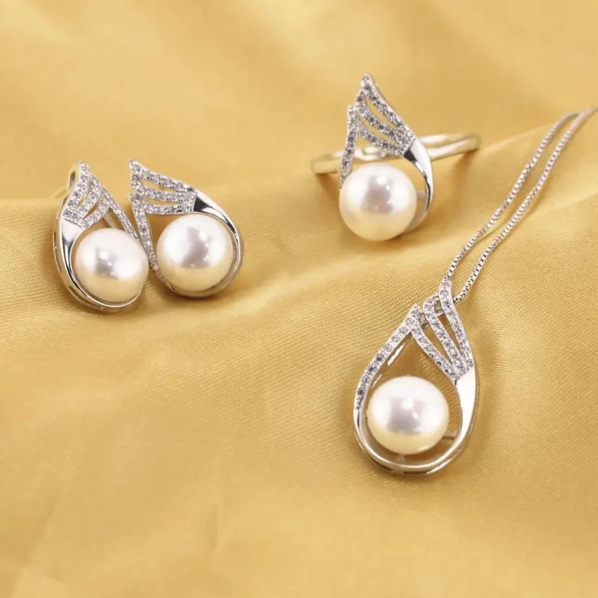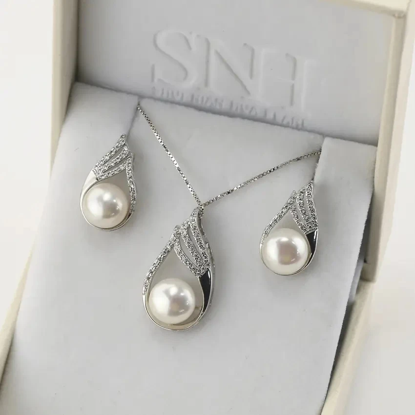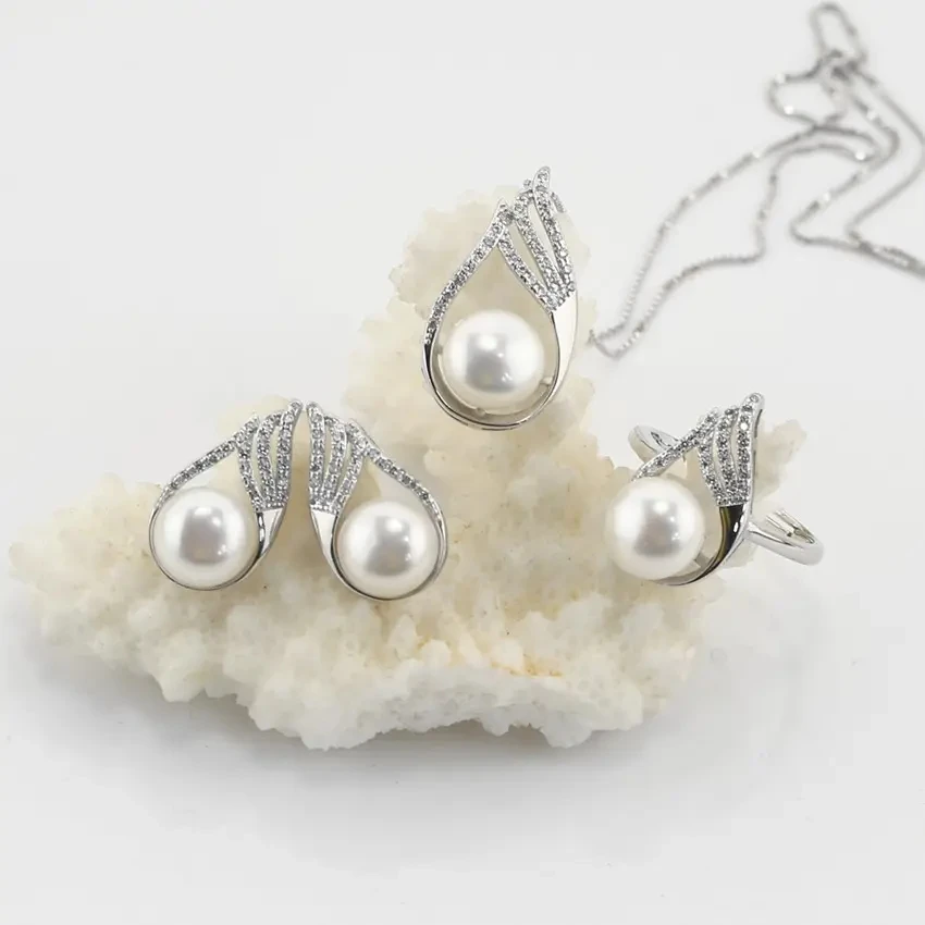 | Design Theme | Elegant silver set featuring pearls and sparkling cubic zirconia stones |